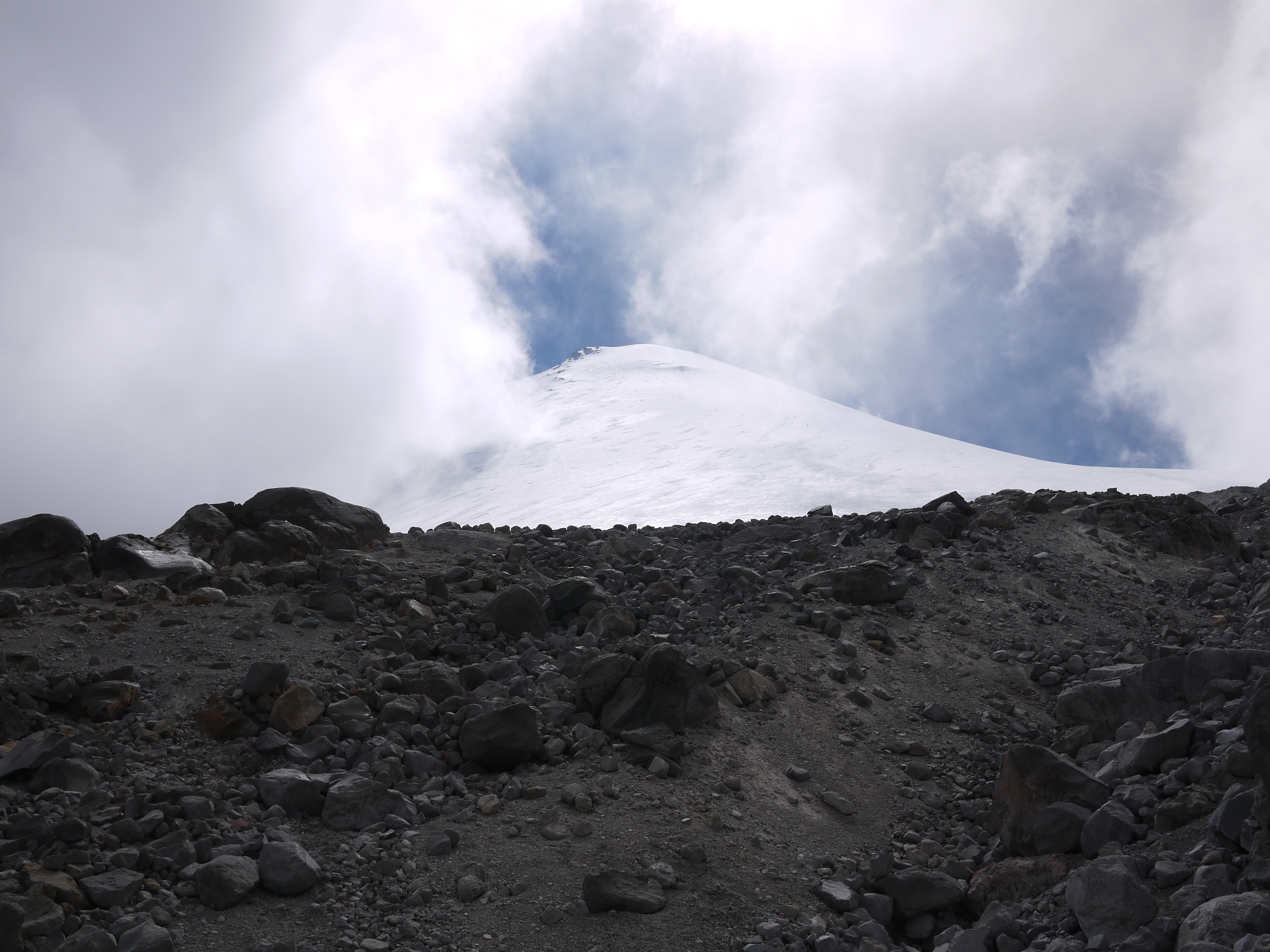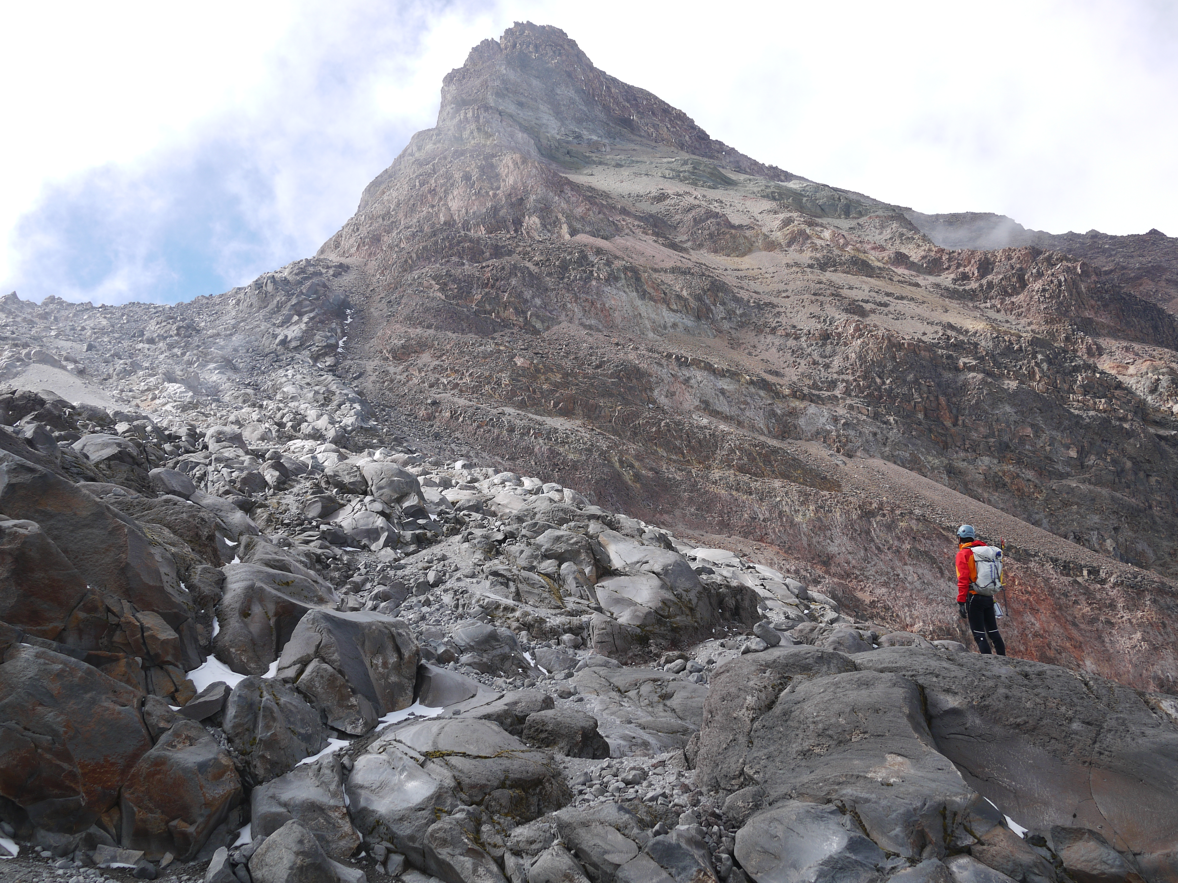 Contrary to popular perception, going down is not always easy. Between exhaustion, the threatening clouds and my enhanced worry of sliding to my death since I was solo, it was SLOW going. Eventually I spotted Vadim waiting for me at the toe of the glacier, a friend to the end. Upon reaching him and collapsing for a few moments, we headed down.