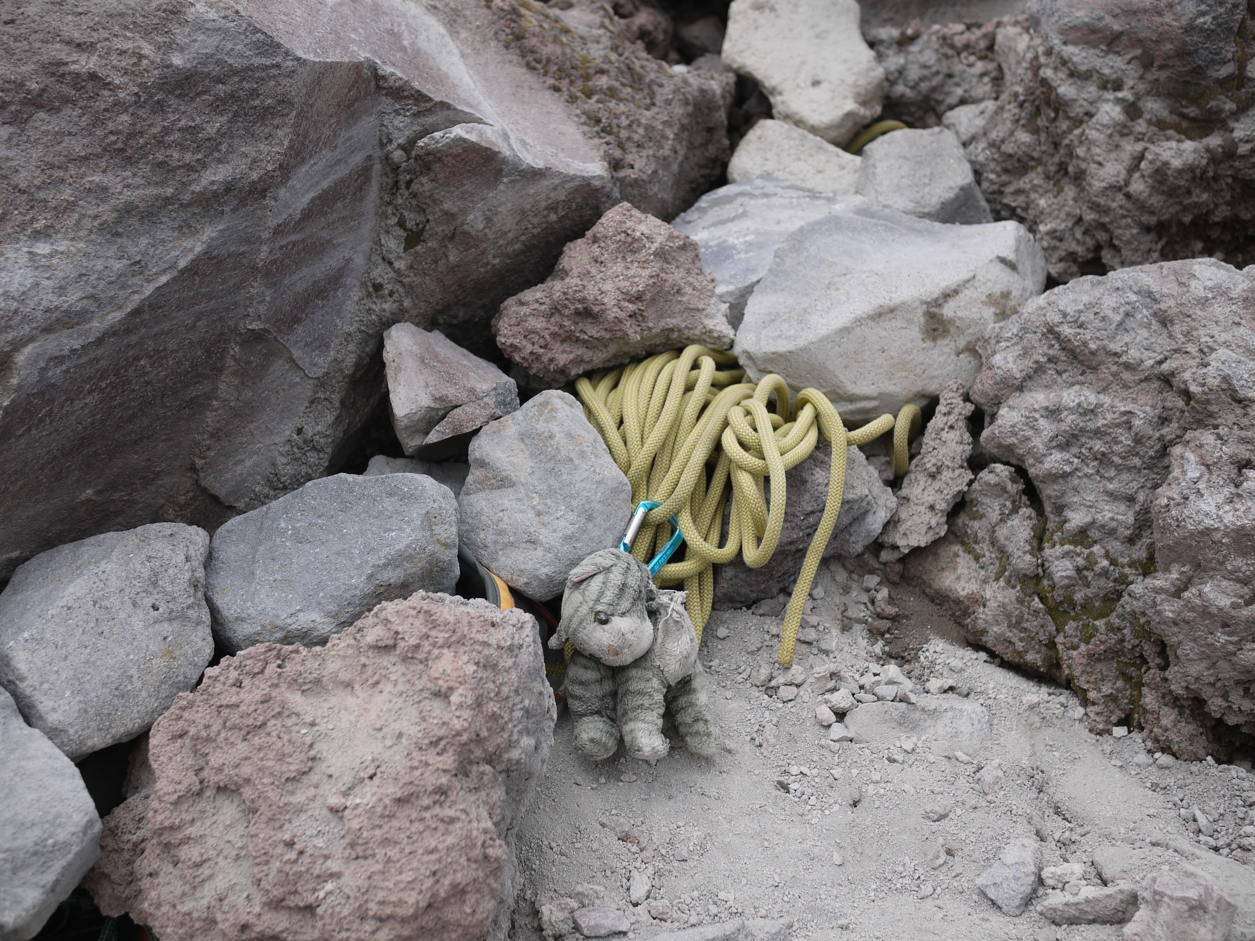 We had decided that the next day would be our scouting mission through the Labyrinth, a 1,500′ maze of glacially deposited boulders that lead to the toe of the glacier. It turned out to be a wise choice since the route had MANY different paths to choose from and it was wise to know the way since on summit day we would be doing this in the dark at 1 AM! As well, we wisely cached our rope, crampons and harnesses (along with Battle Kitty to guard them) as to lessen our weight carried up on summit day. Then we quickly retreated to the hut for food, rest and summit day planning.