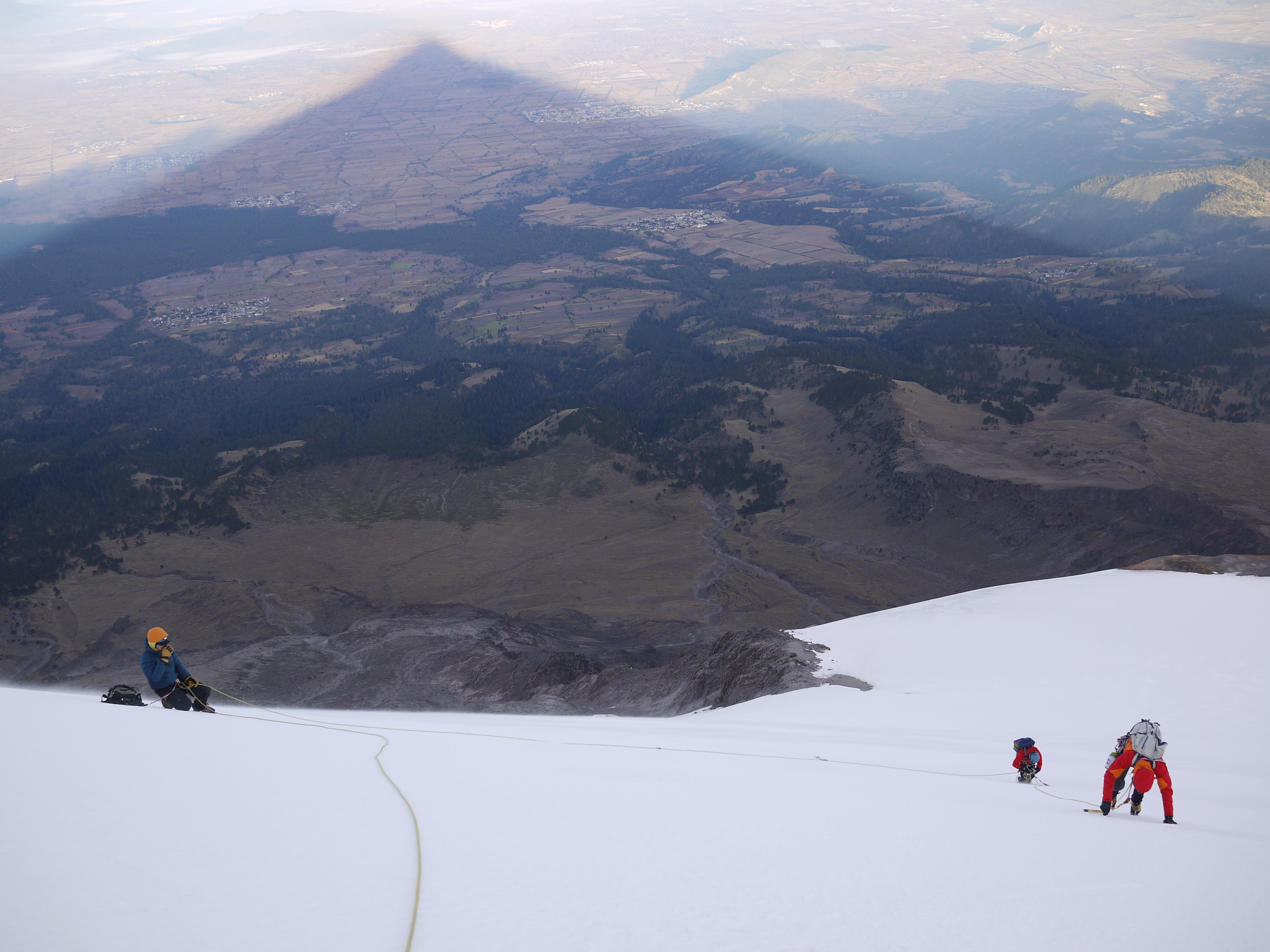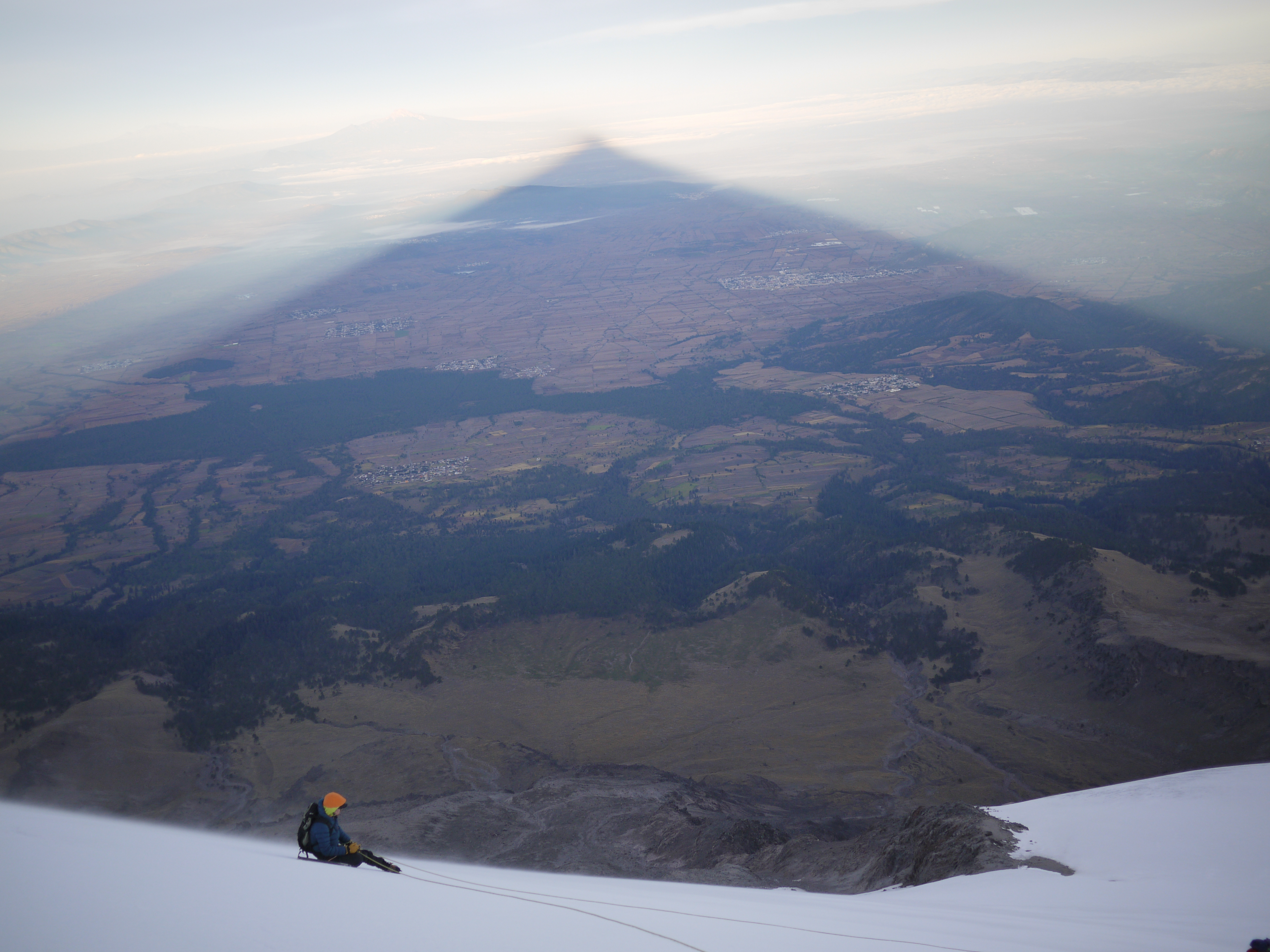 Unfortunately, after about 1,500′ of this sublime ascent, things started to go south, quickly. Turns out a member of our team, Josefa, was starting to feel a little bit ill from altitude. We decided to stop and asses the situation and decided she would need to descend. At first we tried to girth-hitch and tie all our webbing and slings together so that Vadim could safely descend with Josefa, leaving Josh and I the rope to summit. However, upon further examination it was decided we would all descend to the toe of the glacier as a team for safety reasons. All was not lost however. During this entire situation, we were all treated to the most beautiful mountain shadow I have ever seen. The silhouette of Orizaba casting a shadow for a hundred miles and engulfing entire towns was simply amazing.