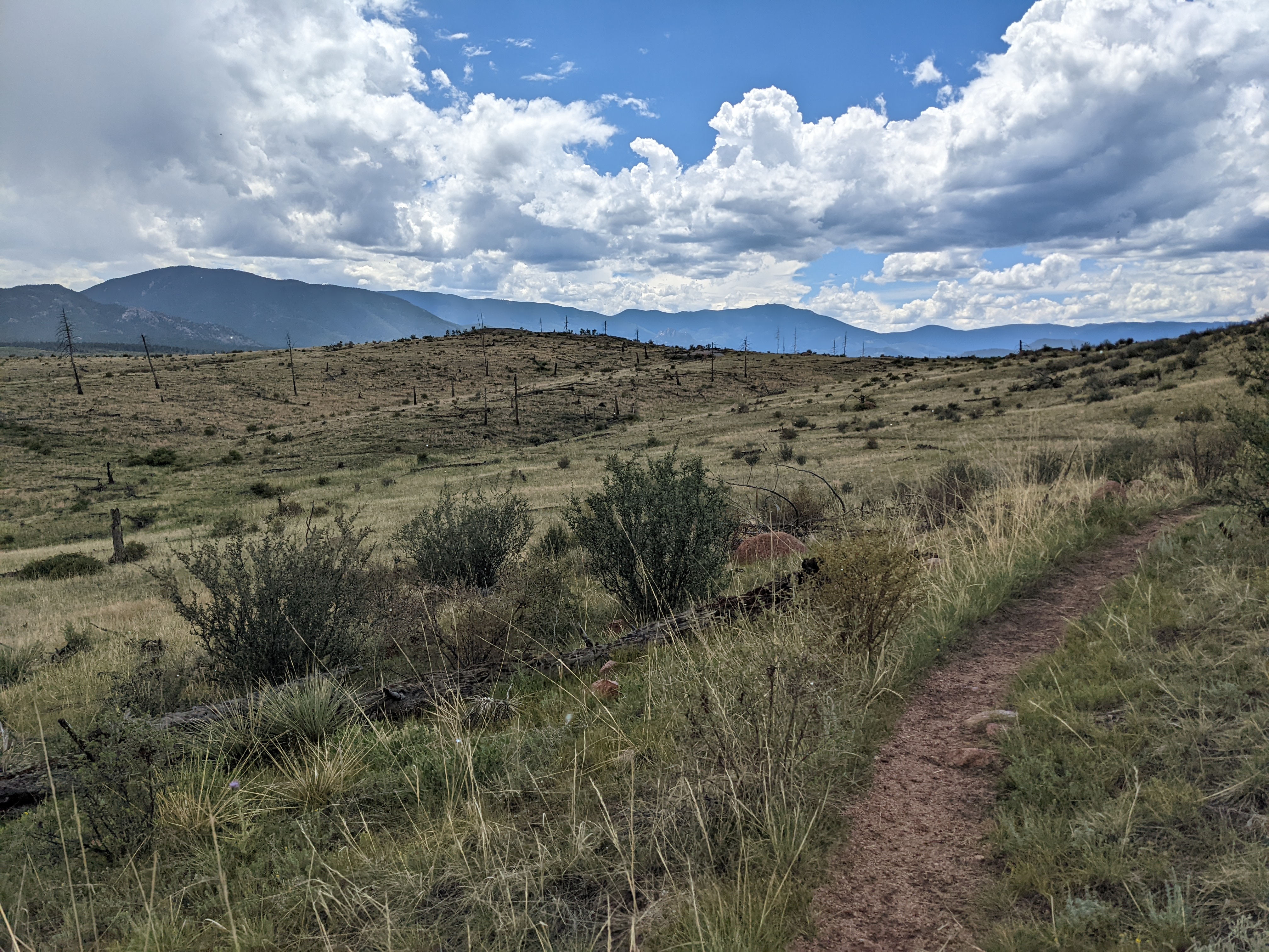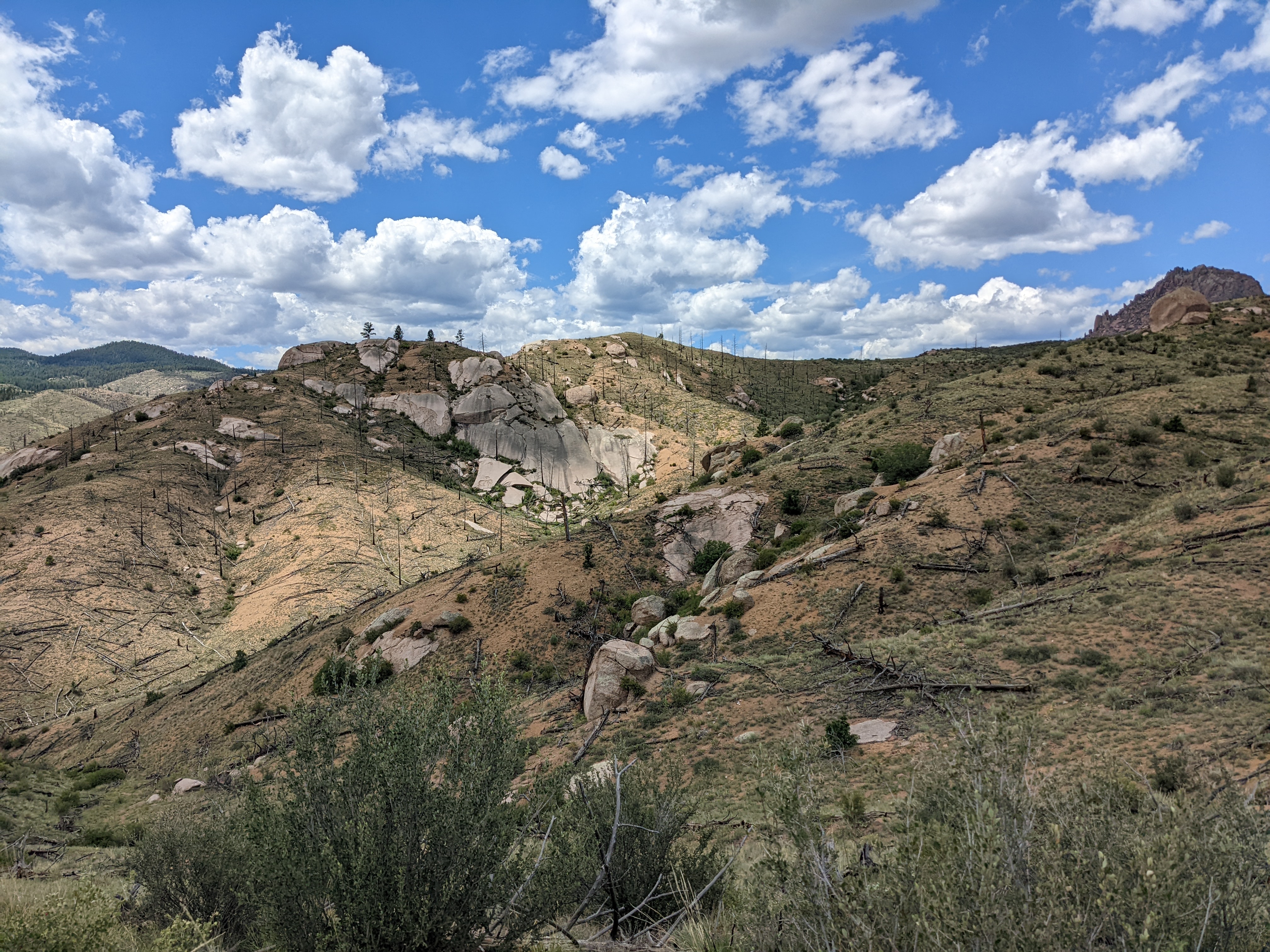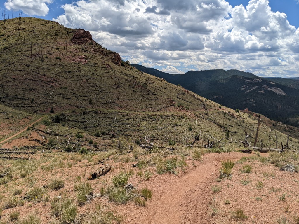 As I climbed into the forest and went up, then down, then up, then down (a constant theme of the CT!) I eventually emerged onto the Buffalo Creek fire-scarred landscape. This was the result of a 1996 wildfire that utterly devastated a huge swath of land SW of Denver. Having lived in the Sierra for almost a decade, the landscape-transforming power of wildfire was nothing new. Sad, for sure, but expected. However, riding a loaded touring bike through an exposed and shade-less area in 80-90 degree heat was HOT. Luckily (or not?), there was a small afternoon storm forming, so there were small moments of shade as rain and lightning began to chase me for the first of many times. Luckily, I was able to escape and make my way back into the trees and towards the end of my first day.