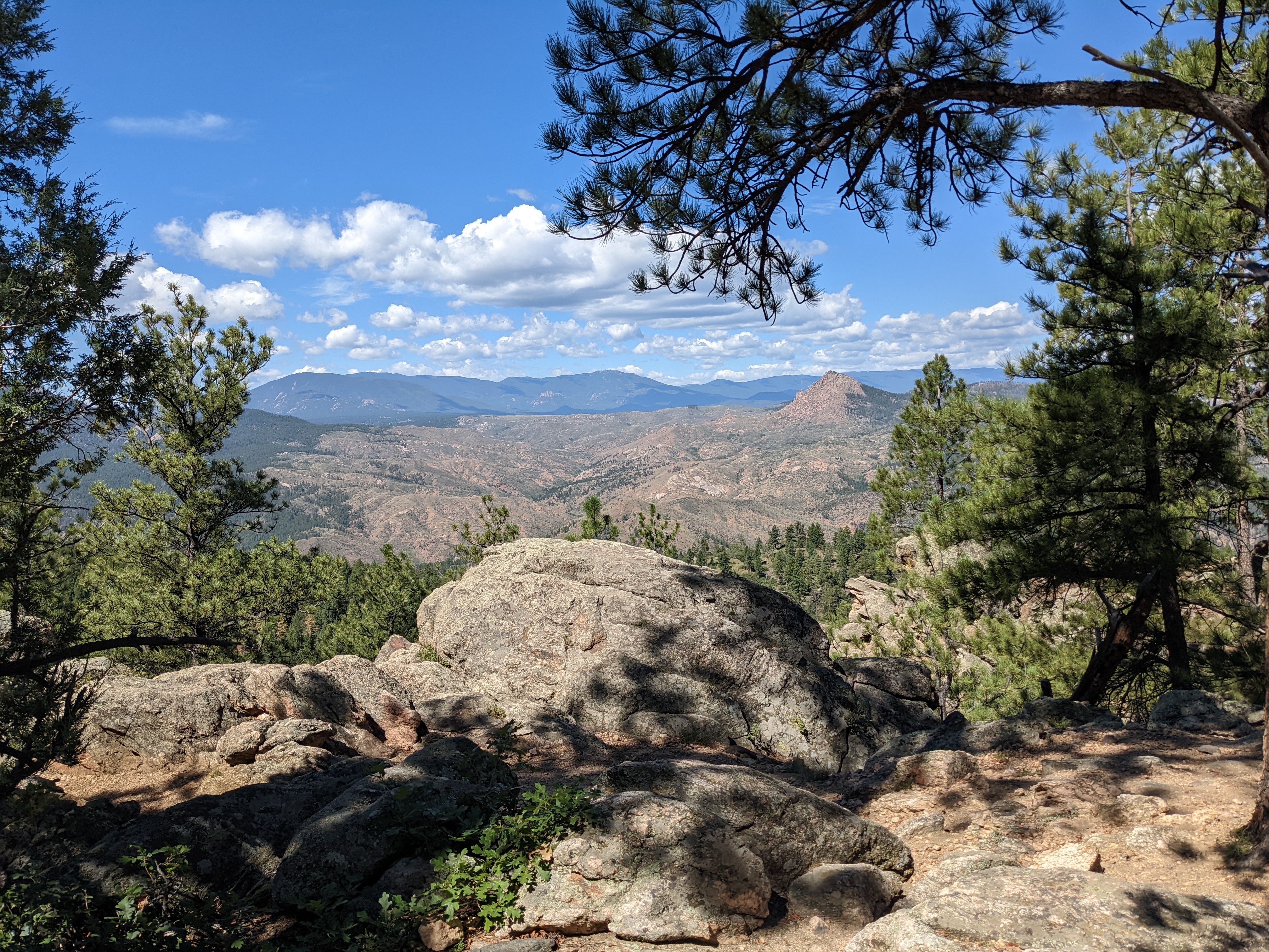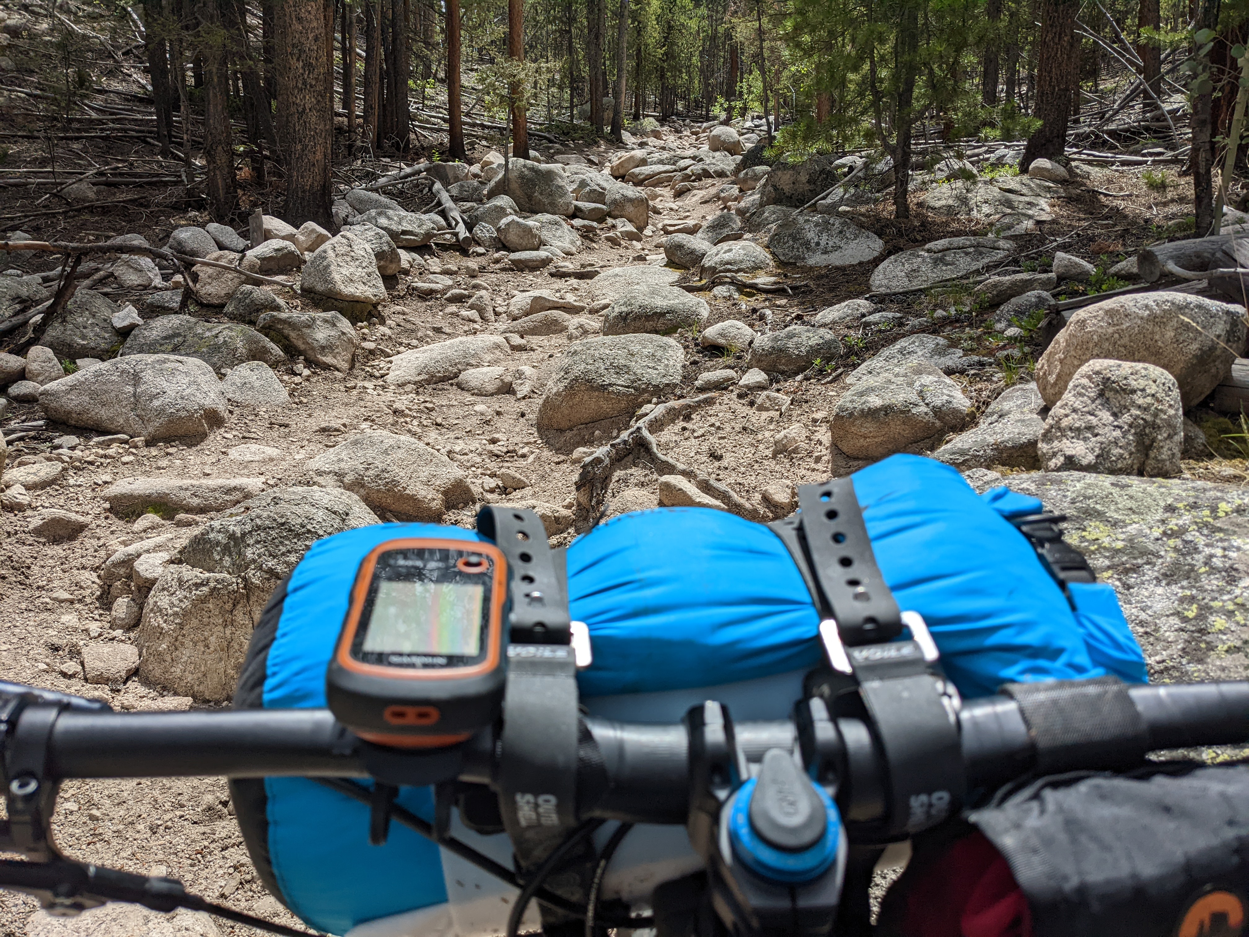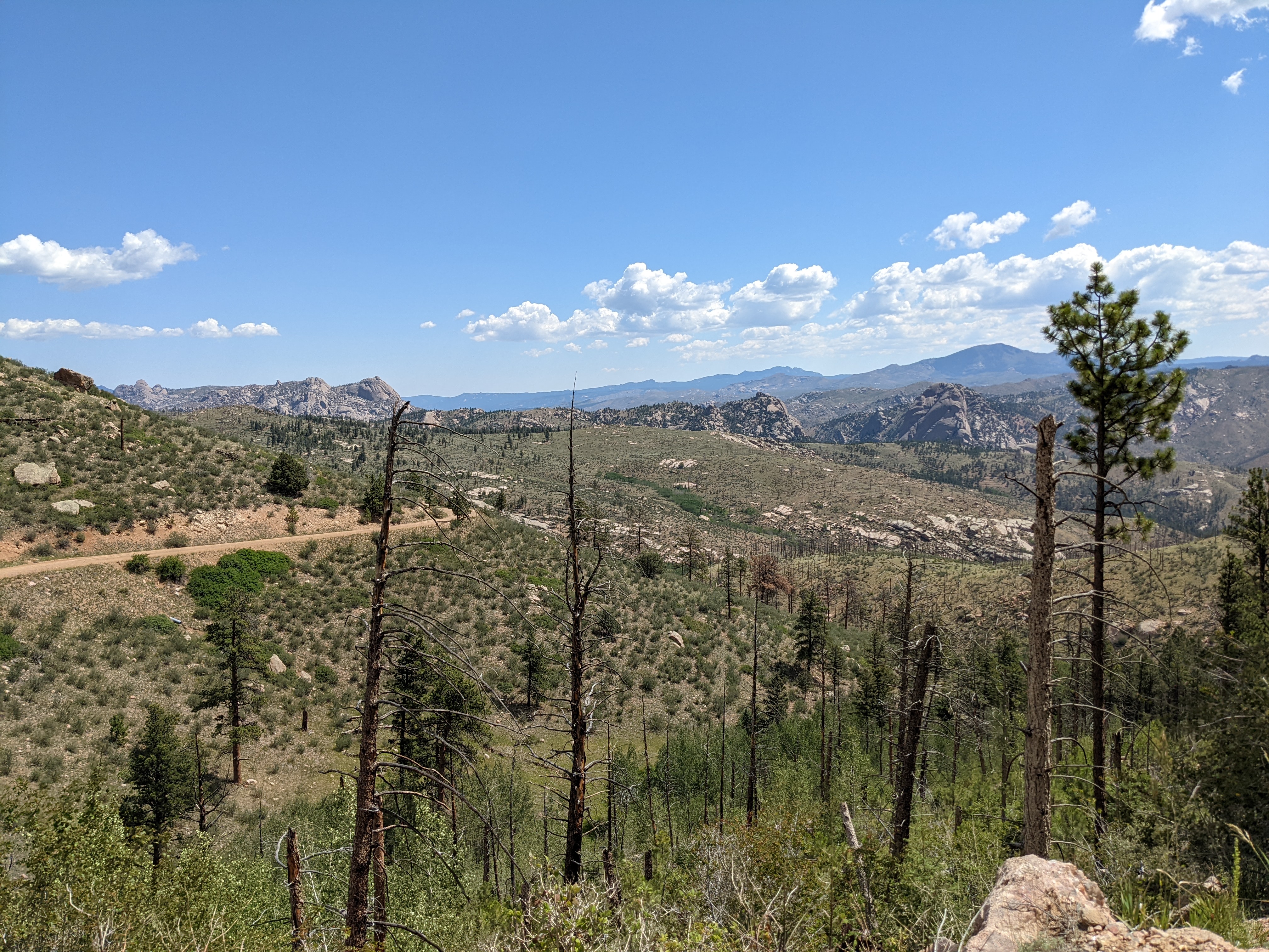 As I climbed into the forest and went up, then down, then up, then down (a constant theme of the CT!) I eventually emerged onto the Buffalo Creek fire-scarred landscape. This was the result of a 1996 wildfire that utterly devastated a huge swath of land SW of Denver. Having lived in the Sierra for almost a decade, the landscape-transforming power of wildfire was nothing new. Sad, for sure, but expected. However, riding a loaded touring bike through an exposed and shade-less area in 80-90 degree heat was HOT. Luckily (or not?), there was a small afternoon storm forming, so there were small moments of shade as rain and lightning began to chase me for the first of many times. Luckily, I was able to escape and make my way back into the trees and towards the end of my first day.
