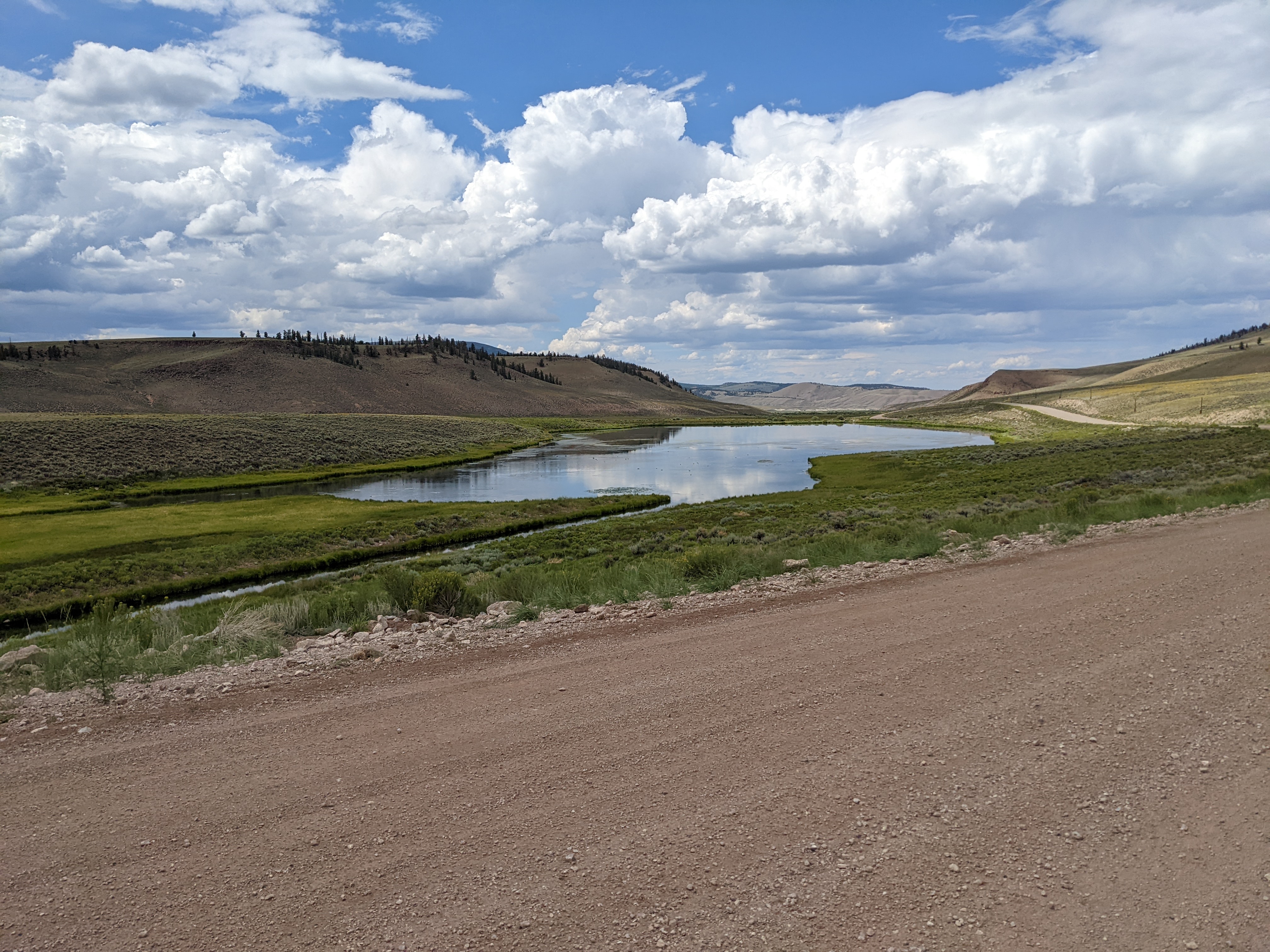 The next day began with an early start and endless miles of beautiful gravel road riding (up, down, up, down, rinse, repeat) and big-sky vistas. I was back in the fire scar and I knew I had a HOT and long day ahead of me. So I popped in the headphones and cruised along all day always on the lookout for a stream to dunk myself in and occasional shade to rest in. This section would be an amazing route to ride on its own in the Fall, something I intend to go back and do, but by mid-afternoon, I was ready to be done. The heat and highway miles were beginning to wear on me and all I could think about was the Stagestop Saloon and the pizza, beer, and soda waiting for me.