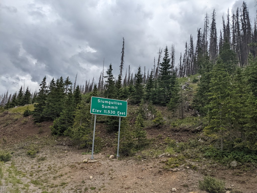 Eventually, after a detour down Pole Creek and up a rough dirt road (520) to avoid the rain and lightning on the ridge, we began the relentless slog uphill to the last pass. After a couple hours of watching me struggle to stay upright and mumble incoherently to myself, Martin insisted I stick out my thumb and try and catch a ride from the off-roaders who passed us every 30 minutes or so. Eventually, I did as advised by the good doctor but decided I would only hitch a ride to the pass, I was determined to ride the final 10 miles (all downhill) into Silverton. If I was going to bail, I was going to do down fighting!
